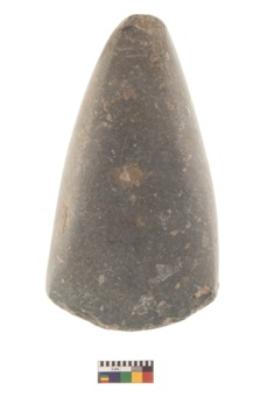 | Description / विवरण | Specimen of triangular shaped Axe with lenticular section and pointed butt. It is under side flat and upper slightly bulging out.It have sharp edge. |
