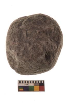 | Description / विवरण | Specimen of a hammer stone roughly rounded in shape with grounded edges and flattish base. |