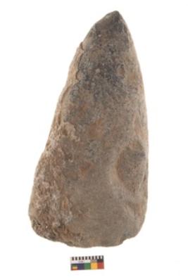 | Description / विवरण | Specimen of triangular shaped Axe with lenticular section and pointed butt. It is under side flat and upper slightly bulging out. |
