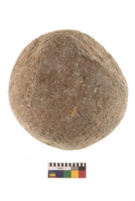 | Description / विवरण | Specimen of a spherical shaped hammer stone with battered surface. |