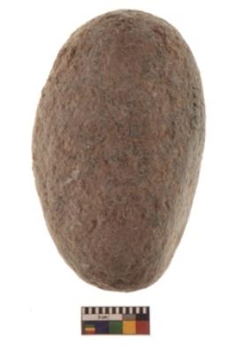 | Description / विवरण | Specimen of a hammer stone roughly rounded in shape with grounded edges and flattish base. |