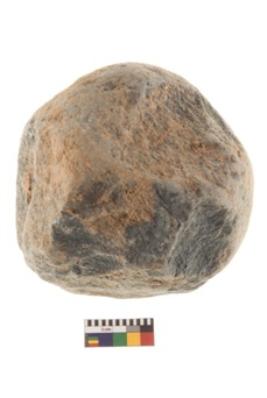 | Description / विवरण | Specimen of a spherical shaped hammer stone with battered surface. |