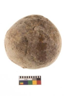 | Description / विवरण | Specimen of a spherical shaped hammer stone with battered surface. |