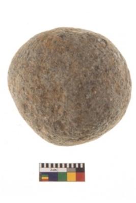 | Description / विवरण | Specimen of a spherical shaped hammer stone with battered surface. |