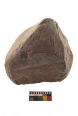 | Description / विवरण | Specimen of a hammer stone roughly rounded in shape with grounded edges and flattish base. |