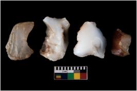 | Description / विवरण | There are n 4 ; worked utilized flakes; there are multidirectional irregular scar pattern on both dorsal and ventral face of the flakes. Two of them are tapering at one end. All are having sharp edges. |