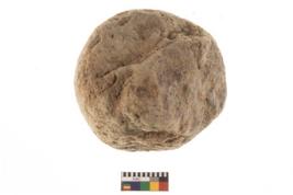 | Description / विवरण | Specimen of a spherical shaped hammer stone with battered surface. |