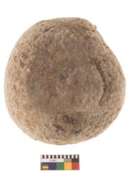 | Description / विवरण | Specimen of a spherical shaped hammer stone with battered surface. |