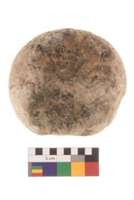 | Description / विवरण | Specimen of a spherical shaped hammer stone with battered surface. |