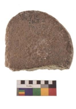 | Description / विवरण | Specimen of a roughly rectangular rubber stone with oval section. It is heaving flat base. |