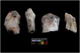 | Description / विवरण | There are n 4 utilized flake cores. There are multidirectional irregular scar pattern on both dorsal and ventral face of the flake cores. One has sharp edges and three have blunted edges. |