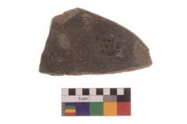 | Description / विवरण | Specimen of an irregular shape potter tool. It is gray ware with fine fabric in sharp contrast. |