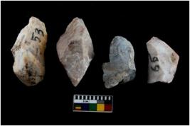 | Description / विवरण | There are n 4 utilized flake cores. There are multidirectional irregular scar pattern on both dorsal and ventral face of the flake cores. One has sharp edges and three have blunted edges. |