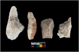 | Description / विवरण | There are n 4 utilized flake cores. There are multidirectional irregular scar pattern on both dorsal and ventral face of the flake cores. One has sharp edges and three have blunted edges. |