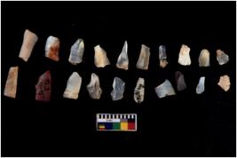 | Description / विवरण | Specimen of flakes tool with prominent flaking marks. It made up of a short flakes with sides trimmed. |