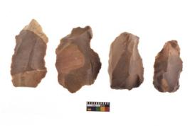 | Description / विवरण | There are n 4 of utilized worked cores and show irregular scar pattern on both dorsal and ventral side. Three are tapering at one end. |