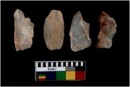 | Description / विवरण | There are n 4 utilized flake cores. There are multi directional irregular scar pattern on them. All of them are tapering at one end. |