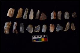 | Description / विवरण | Specimen of flakes tool with prominent flaking marks. It made up of a short flakes with sides trimmed. |