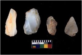 | Description / विवरण | There are n 4 of utilized worked cores and show multidirectional irregular scar pattern on both dorsal and ventral sides. One has a broken tip. |