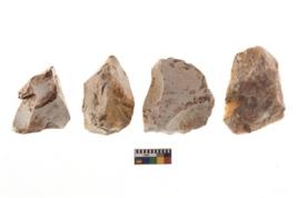 | Description / विवरण | There are n 4 of utilized worked cores and show irregular scar pattern on both dorsal and ventral side. Two have a broken tip. |