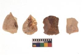| Description / विवरण | There are n 4 of utilized worked cores and show irregular scar pattern on both dorsal and ventral side. Two have a broken tip. |