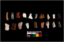 | Description / विवरण | Specimen of flakes tool with prominent flaking marks. It made up of a short flakes with sides trimmed. |