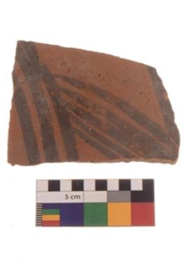 | Description / विवरण | Specimen of Potsherd black on red painted pottery. It is fine fabric in sharp contrast with painted design are executed in black pigment. |