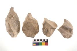 | Description / विवरण | There are n 4 of utilized worked cores and irregular dominant scar pattern on both dorsal and venral side. They are tapering at one end. |