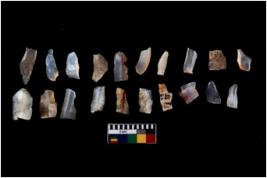 | Description / विवरण | Specimen of flakes tool with prominent flaking marks. It made up of a short flakes with sides trimmed. |