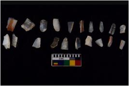 | Description / विवरण | Specimen of flakes tool with prominent flaking marks. It made up of a short flakes with sides trimmed. |
