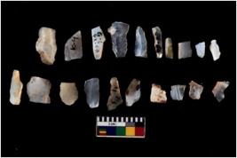 | Description / विवरण | Specimen of flakes tool with prominent flaking marks. It made up of a short flakes with sides trimmed. |