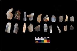 | Description / विवरण | Specimen of flakes tool with prominent flaking marks. It made up of a short flakes with sides trimmed. |