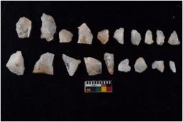 | Description / विवरण | Specimen of flakes tool with prominent flaking marks. It made up of a short flakes with sides trimmed. |