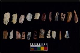 | Description / विवरण | Specimen of flakes tool with prominent flaking marks. It made up of a short flakes with sides trimmed. |