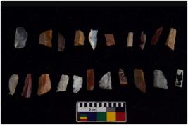 | Description / विवरण | Specimen of flakes tool with prominent flaking marks. It made up of a short flakes with sides trimmed. |