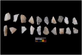 | Description / विवरण | Specimen of flakes tool with prominent flaking marks. It made up of a short flakes with sides trimmed. |