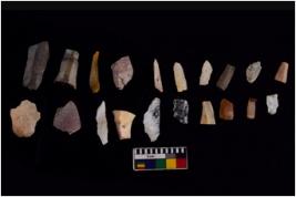 | Description / विवरण | Specimen of flakes tool with prominent flaking marks. It made up of a short flakes with sides trimmed. |
