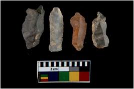| Description / विवरण | There are n 4 utilized flake cores. Out of them three are made up of Chalcedony and one is made up of Chert. There are multi directional irregular scar pattern on them. All of them are tapering at one end. |