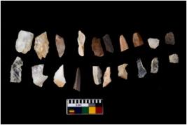 | Description / विवरण | Specimen of flakes tool with prominent flaking marks. It made up of a short flakes with sides trimmed. |