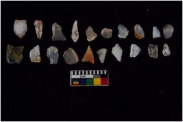 | Description / विवरण | Specimen of flakes tool with prominent flaking marks. It made up of a short flakes with sides trimmed. |