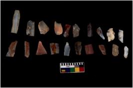 | Description / विवरण | Specimen of flakes tool with prominent flaking marks. It made up of a short flakes with sides trimmed. |