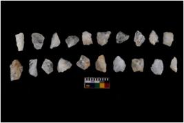 | Description / विवरण | Specimen of flakes tool with prominent flaking marks. It made up of a short flakes with sides trimmed. |