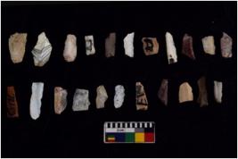 | Description / विवरण | Specimen of flakes tool with prominent flaking marks. It made up of a short flakes with sides trimmed. |