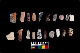 | Description / विवरण | Specimen of flakes tool with prominent flaking marks. It made up of a short flakes with sides trimmed. |