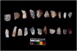 | Description / विवरण | Specimen of flakes tool with prominent flaking marks. It made up of a short flakes with sides trimmed. |