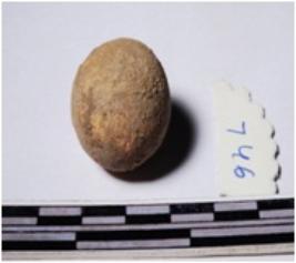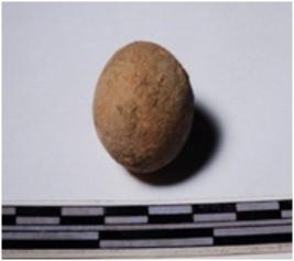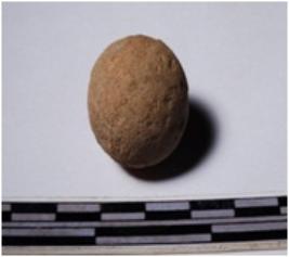| Description / विवरण | A terracotta sling ball, round in shape of smooth surface. |
