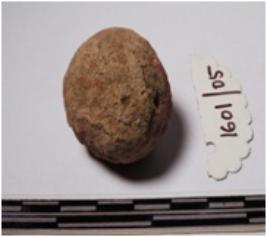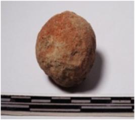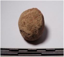 | Description / विवरण | A terracotta round shaped sling ball of rough surface. |