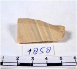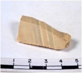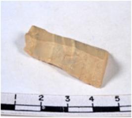 | Description / विवरण | A fragment of a rectangular shaped chert blade showing dorsal sides with sharp cutting edges having smooth surface and triangular section. |