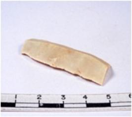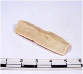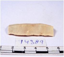 | Description / विवरण | A fragment of a rectangular shaped chert blade showing dorsal sides with sharp cutting edges having smooth surface and triangular section. |