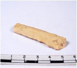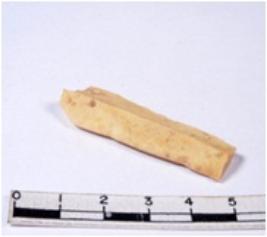 | Description / विवरण | A fragment of a rectangular shaped chert blade showing dorsal sides with sharp cutting edges having smooth surface and triangular section. |